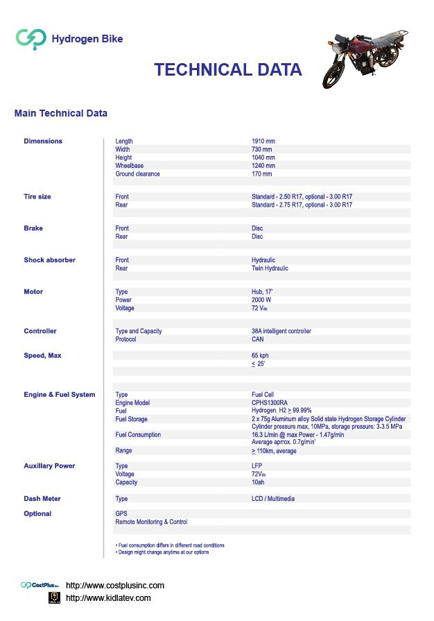The Hydrogen Bike prototype is powered by our compact 1.3kW air-cooled PEM fuel cell stack, delivering high current density at minimal weight — ideal for urban mobility. Using advanced solid-state hydrogen storage, this bike targets a range of 100–120 km per charge, with silent operation and rapid refueling.